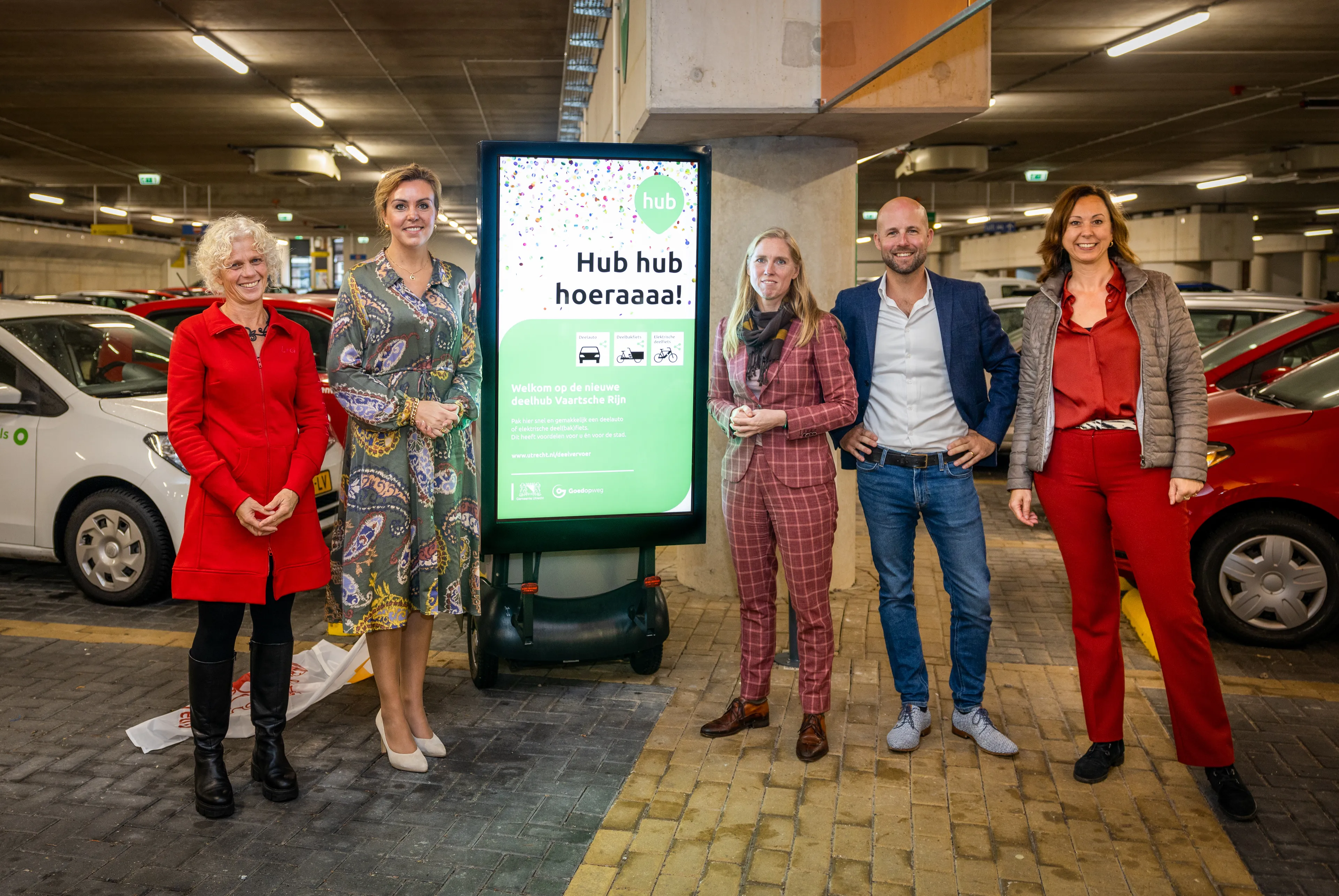 Bij de kersverse deelhub Vaartsche Rijn staan deelauto's en elektrische (bak)fietsen. De deelhub is vormgegeven conform de nieuwe landelijke identiteit voor deelhubs (genaamd “HUB”) en dus naast een herkenbaar logo voorzien van de uniforme bewegwijzering, vakmarkering en bebording. Elke reiziger in Nederland weet daarmee wat ze minimaal kunnen verwachten op deze hubs als het gaat om de kwaliteit van het aanbod deelvervoer en eventuele aanvullende diensten. Het sluit daarbij aan op bestaande concepten, zoals het stationsconcept van NS. De komende jaren gaat de gemeente Utrecht meerdere deelhubs realiseren in Utrecht.