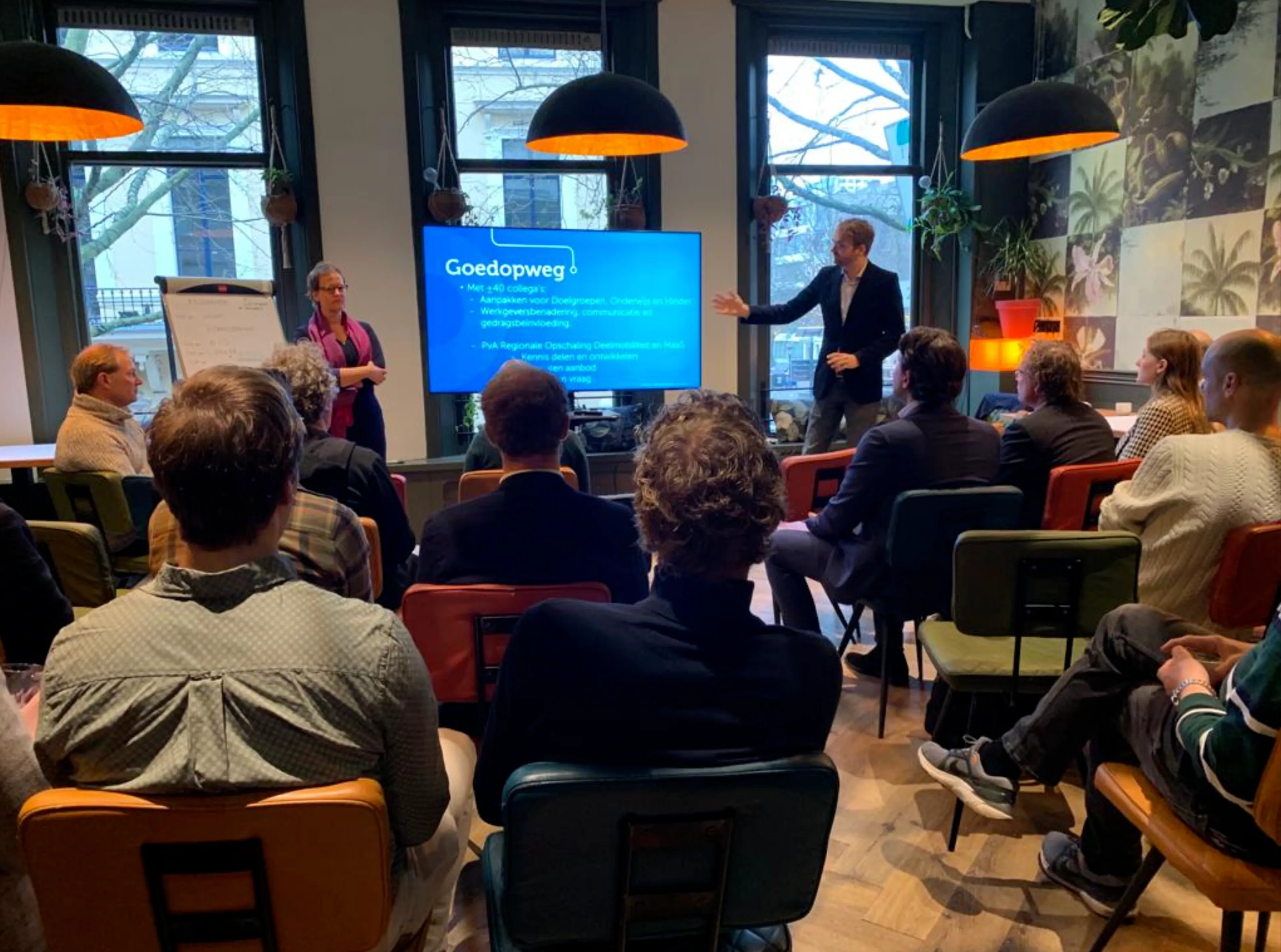 De startbijeenkomst heeft Goedopweg samen de Gooicorridor georganiseerd. Beiden partijen gaan de komende tijd stappen zetten in het (regionaal) opschalen van deelmobiliteit en MaaS. In het kader van de verbinding zoeken en over grenzen heen kijken was dit een mooie aanleiding om voor beide werkgebieden maar één startbijeenkomst te organiseren. En met succes, veel gemeentelijke, regionale en provinciale beleidsadviseurs in de Provincie Utrecht en de Gooicorridor, die zich bezighouden met (duurzame) mobiliteit waren vertegenwoordigd. Het programma was goed gevuld met inspirerende presentaties vanuit het Nationaal Samenwerkingsprogramma Deelmobiliteit het, provincie Utrecht, NS en de regio Twente. En tot slot hebben alle aanwezigen nog veel input gegeven op de verschillende thema’s voor de werkateliers. Het was dan ook een vruchtbare bijeenkomst.